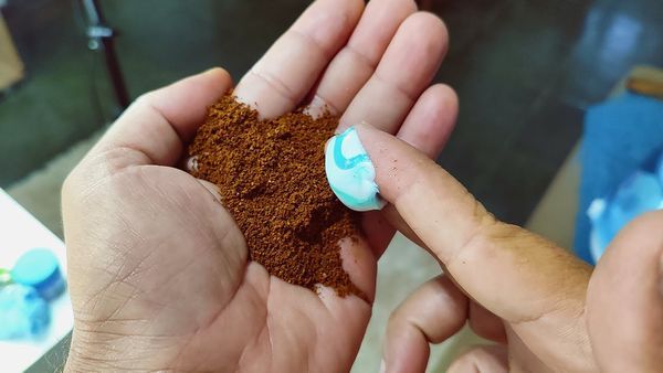 Combine 1 teaspoon of coffee grounds with a pea-sized amount of toothpaste.